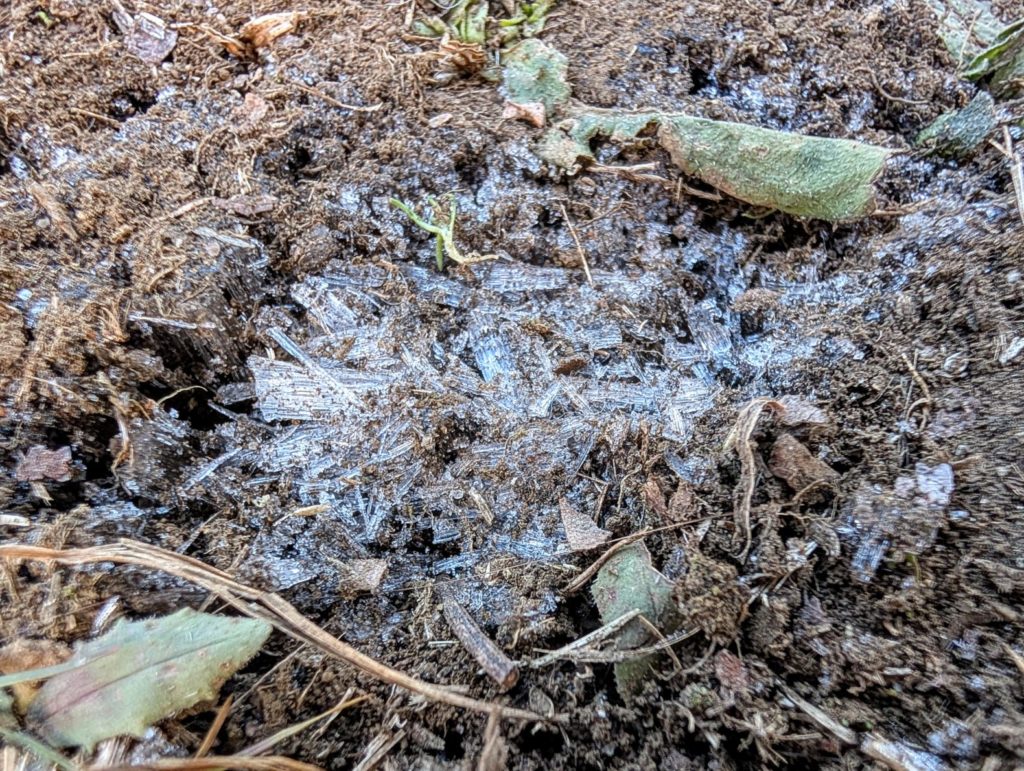 夜の冷え込みで地表が0℃以下になると、土の中の水分が毛細管現象によって地表へ上がり、上がってきた水が凍る → さらに水を引き上げる