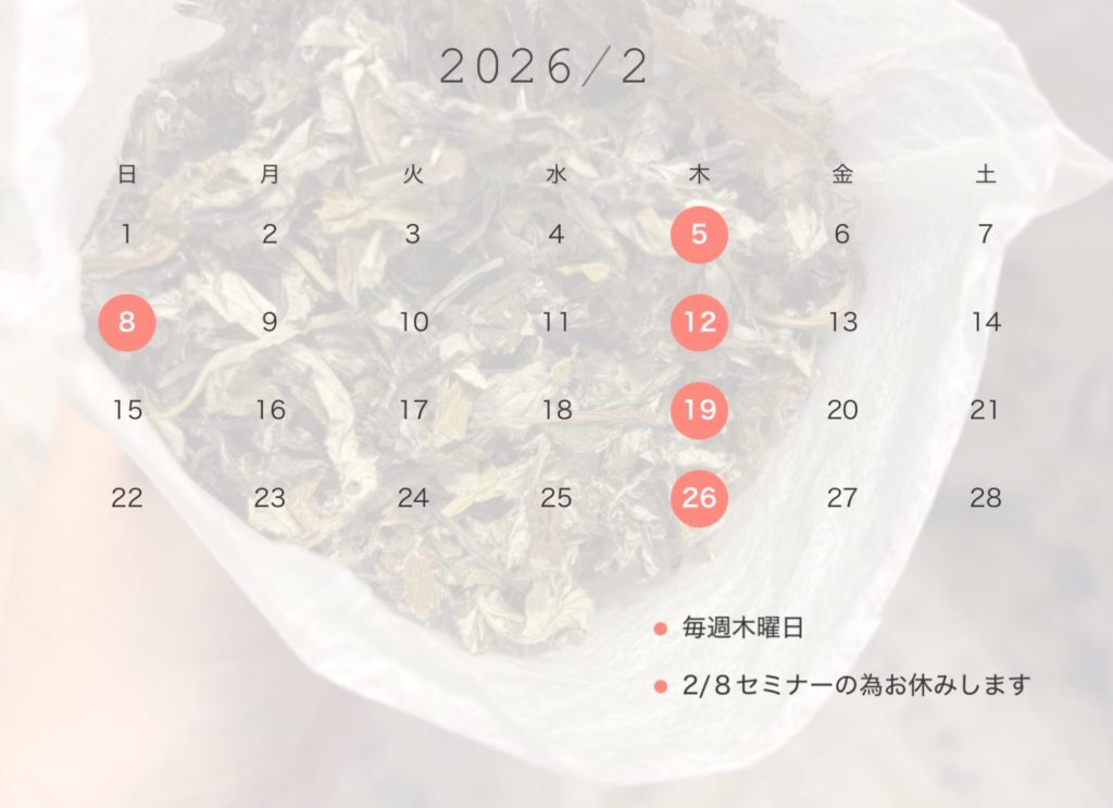 2月も木曜日定休で営業いたします、どうぞ宜しくお願いします。2/8(日)はセミナーの為お休みします。